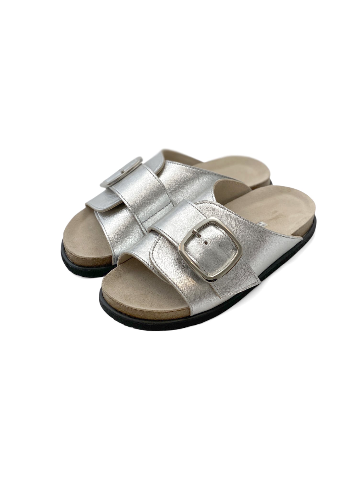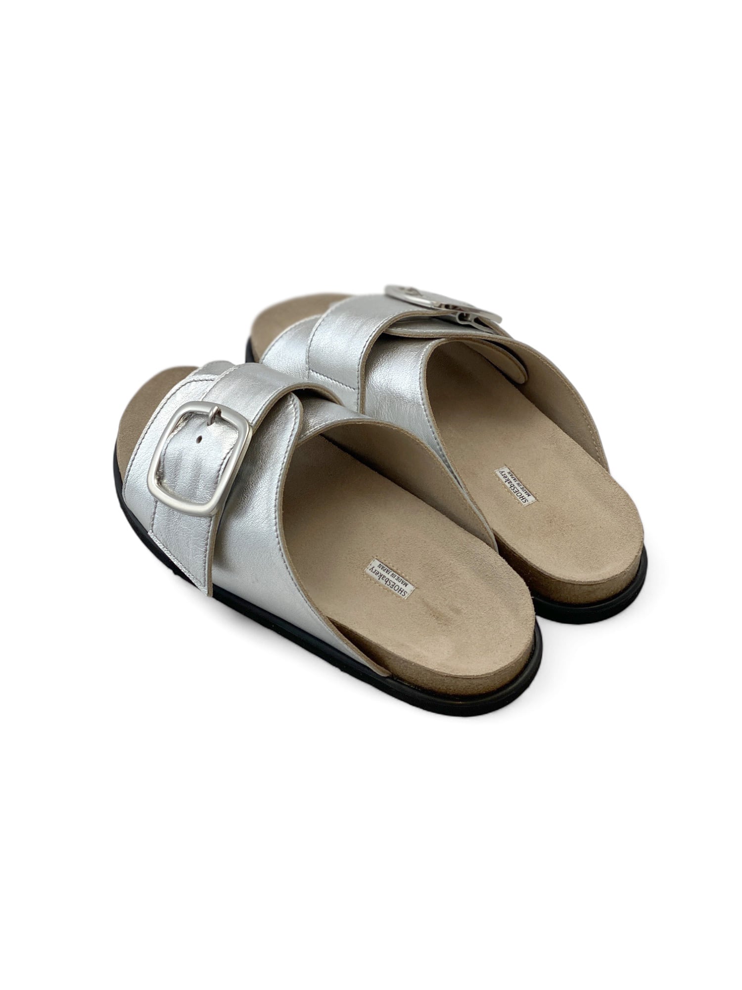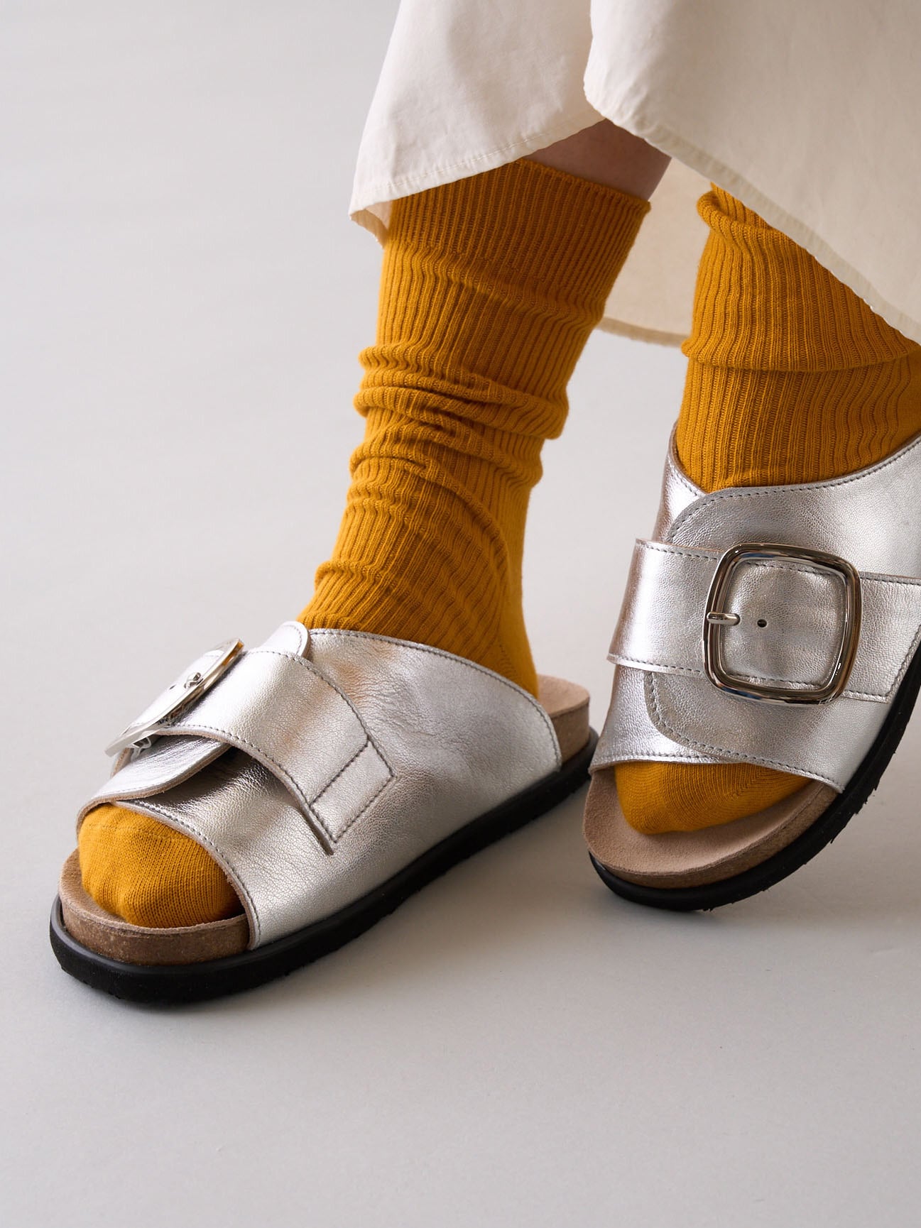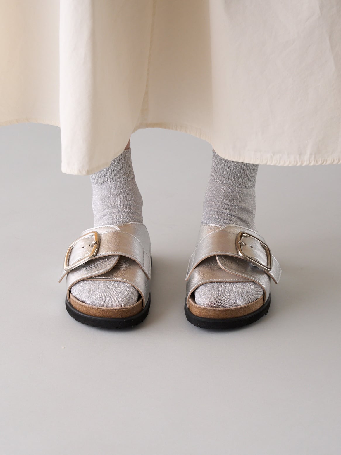 40mmの華やかなバックルは、ゴールドとシルバーの2色展開。上品な印象を与えながら、カジュアルなコーディネートに華を添えます。足の形にフィットする立体的なインソールは、柔らかいスポンジ素材を使用しており、長時間の使用でも快適です。